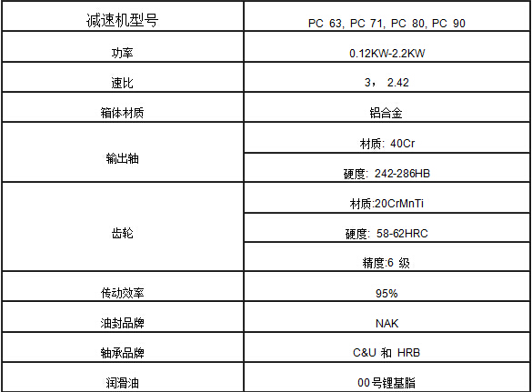 PC系列減速機(jī)是采用模塊化結(jié)構(gòu)設(shè)計(jì)的單級(jí)齒輪傳動(dòng)減速機(jī)-即PC063型單級(jí)齒輪傳動(dòng)減速機(jī)的傳動(dòng)比i=3.0;PC071型單級(jí)齒輪傳動(dòng)減速機(jī)的傳動(dòng)比i=3.0;PC080型單級(jí)齒輪傳動(dòng)減速機(jī)的傳動(dòng)比i=3.0;PC090型單級(jí)齒輪傳動(dòng)減速機(jī)的傳動(dòng)i=2.42; PC系列減速機(jī)可以獨(dú)立供貨,也可以直接與NMRV系列蝸桿減速機(jī)組合。